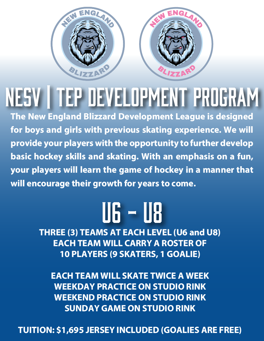 The New England Blizzard Development League is designed for boys and girls with previous skating experience. We will provide your players with the opportunity to further develop basic hockey skills and skating. With an emphasis on a fun, your players will learn the game of hockey in a manner that will encourage their growth for years to come.