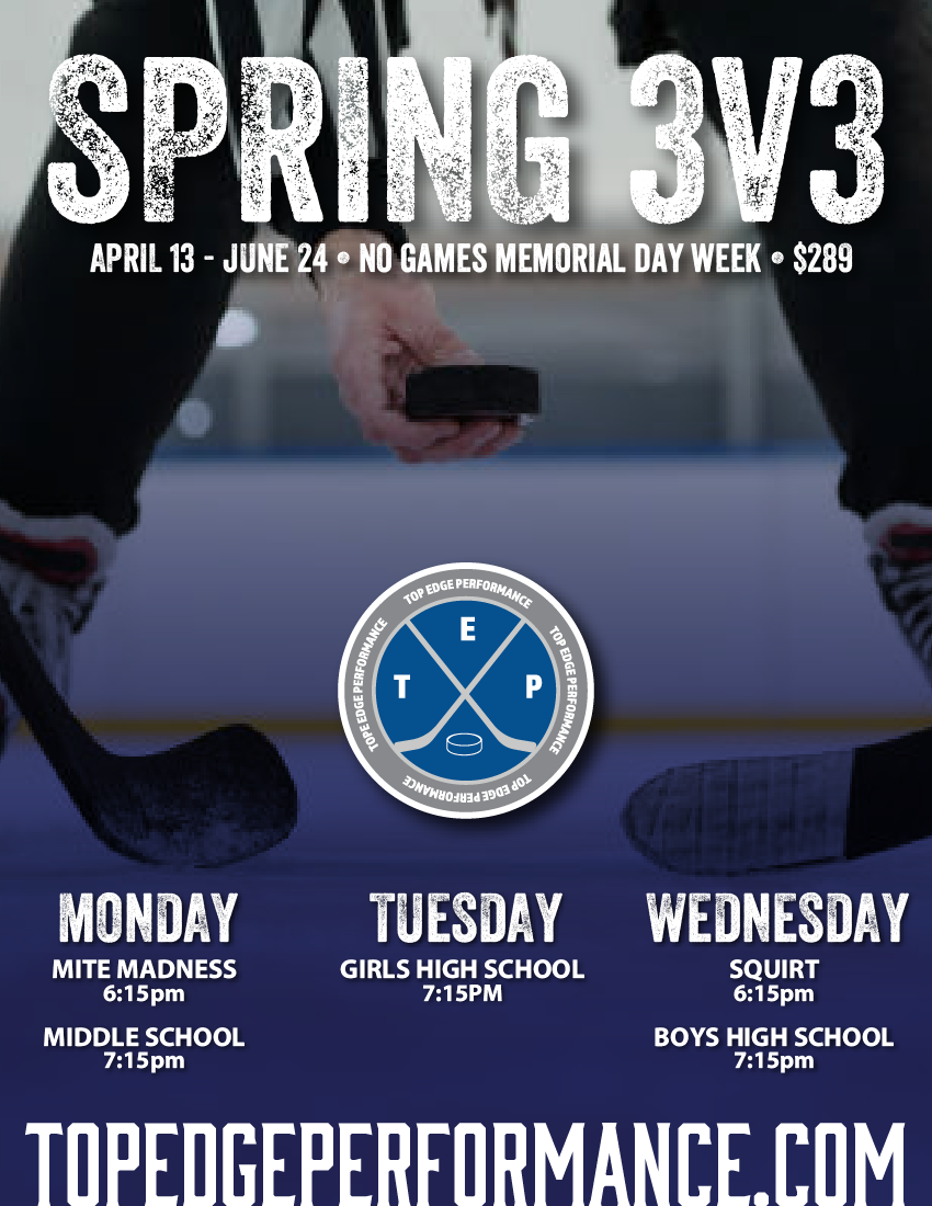 Our Spring 3v3 will begin April 13 and run through June 24, 2026*. We will have five divisions again this season, including a Squirt division! Mite Madness and Middle School will be Monday nights, Girls Only High School will be Tuesday nights, Squirts and Boys Only High School will be Wednesday nights.